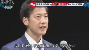 「今苦しい思いをされている方、悩み苦しんでいる方、絶対に自分に負けず、自分を信じて、そして、目標を持って、目標から逃げず、少しずつ少しずつ、前に進んでみてください。きっと幸せが来ると思います」
