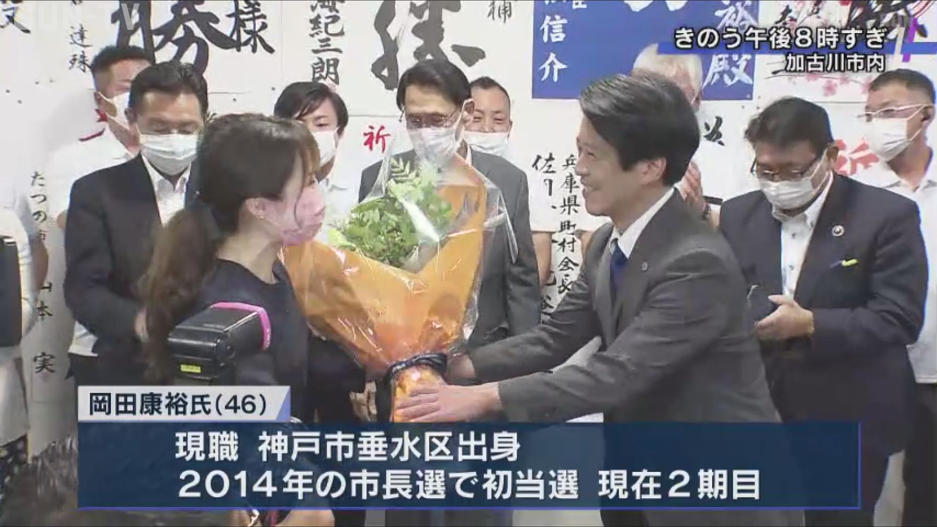 3選を果たした現職の岡田康裕さん(46)は、神戸市垂水区出身で2014年の市長選で初当選し、現在2期目です。
