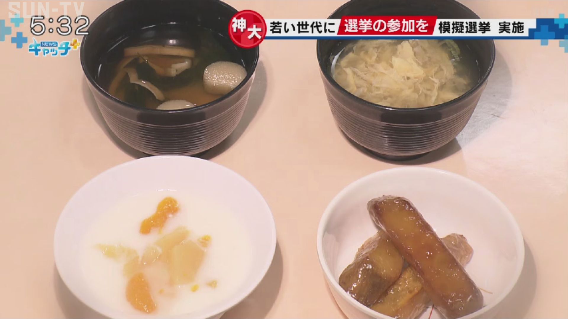 定番メニューである「みそ汁」と「かき玉汁」、そして「フルーツヨーグルト」と「大学芋」。それぞれ汁物とデザートで部門を分けて投票が行われます。