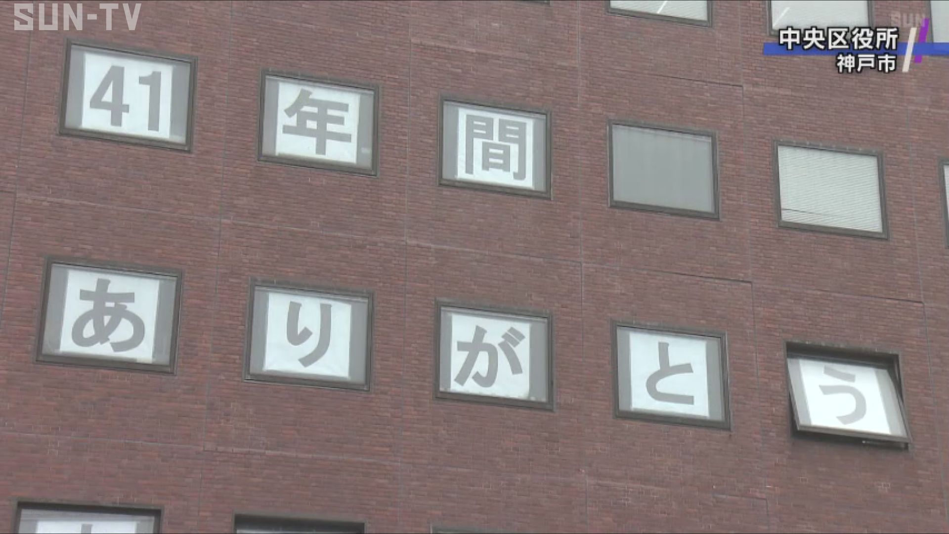 神戸・三宮にある中央区役所の庁舎の窓に張り出された特大のメッセージ。「41年間ありがとう」などと区民への感謝の文字が掲示されています。