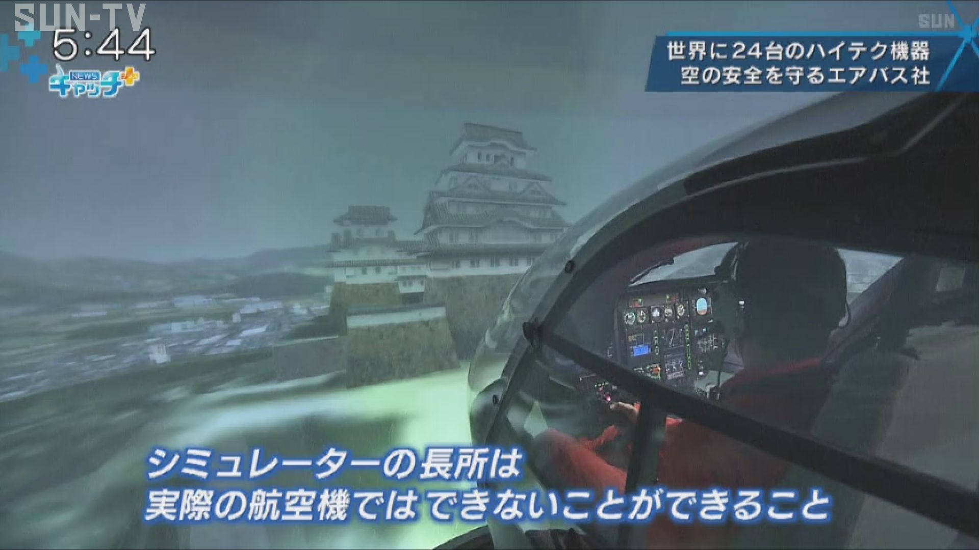 布崎パイロットがシミュレーターならではの訓練を見せてくれました。悪天候でエンジンが故障し姫路城に不時着します。