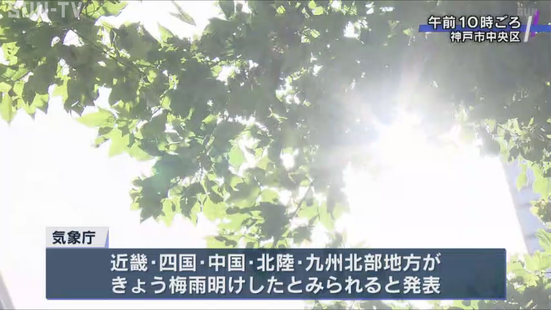 近畿地方で梅雨明け 発表から2週間は統計史上最短 2022.06.2812:20 地域・まち 気象庁は28日、近畿地方が梅雨明けしたとみられると発表しました。 神戸地方気象台によりますと太平洋高気圧が強まり晴れの日が続くことから、気象庁は近畿、四国、中国、北陸、九州北部地方が梅雨明けしたとみられると発表しました。 近畿地方では、平年よりも21日早く1951年の統計開始から最も早い発表です。 また、今月14日の梅雨入り発表から14日間の期間は統計史上最も短いということです。 #梅雨明け 記事のギャラリーを見る ニュース一覧へ戻る