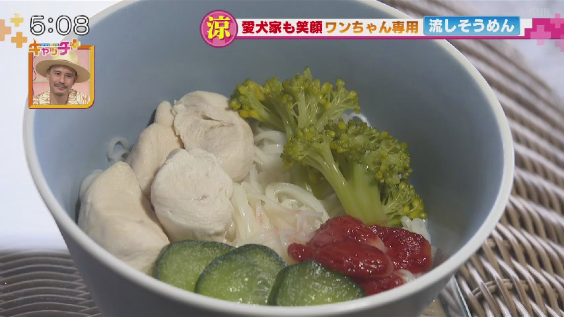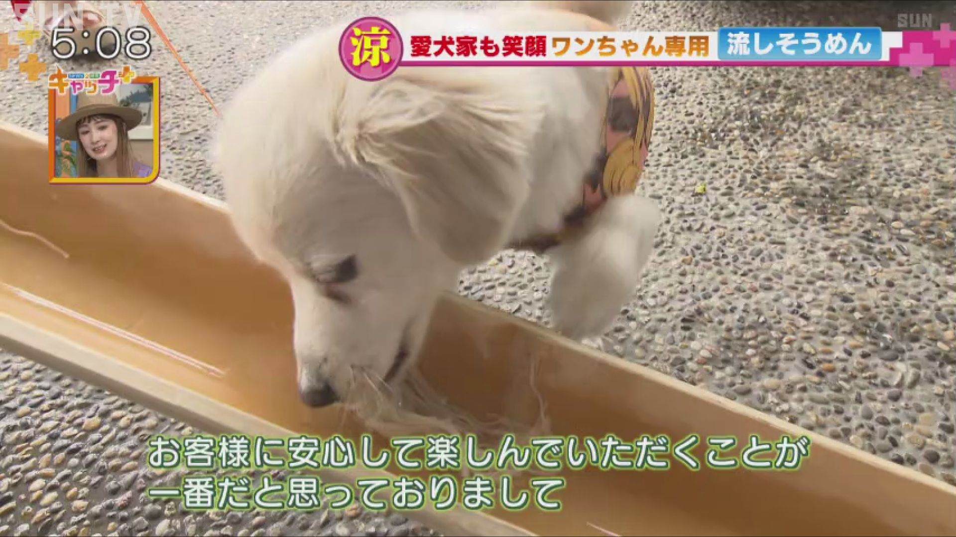 そう、流しそうめん!と言ってもワンちゃん専用の「愛犬 流しそうめん」なんです。西宮市から来た、中堂ご夫妻とトイプードルのエルちゃん。初めての体験で興味津々!1回30分制の流しそうめん。飼い主が愛犬のために、竹にそうめんを流してあげます。