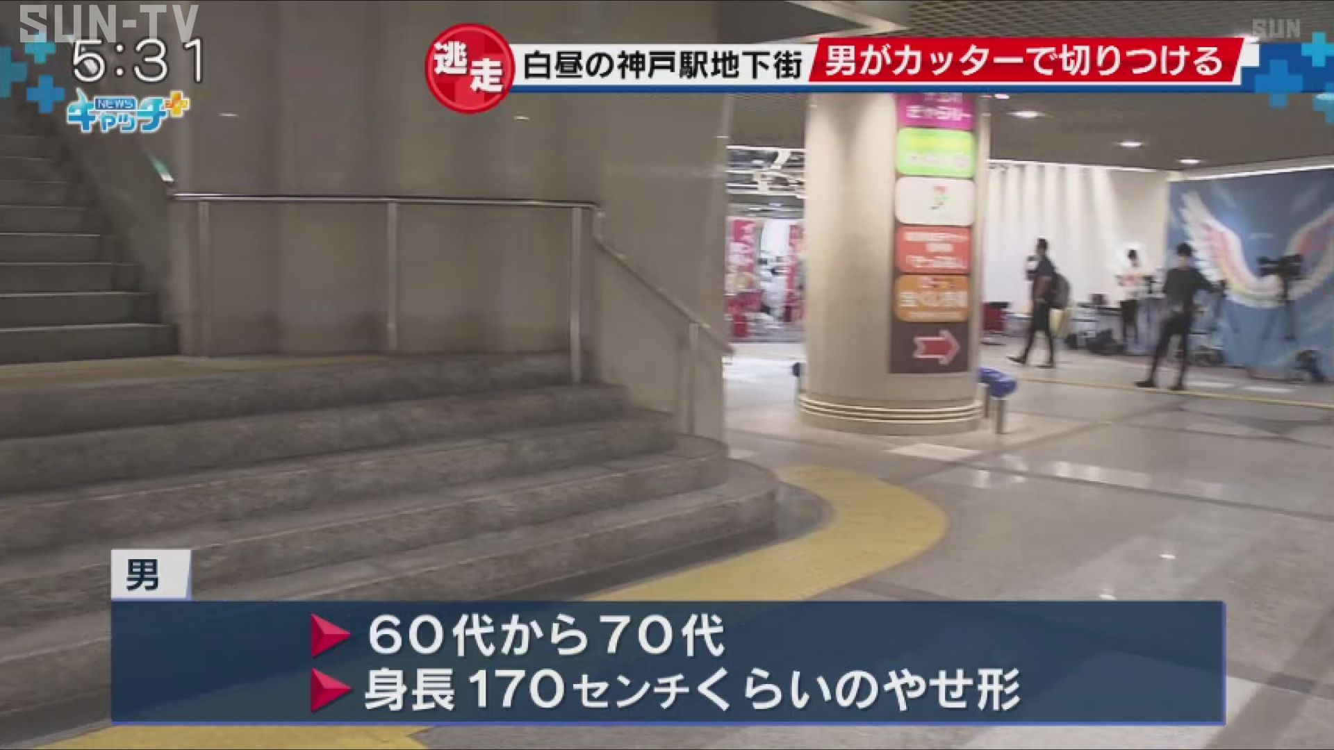 30日午後、JR神戸駅前の地下街で50代の男性が男にカッターナイフのようなもので切りつけられました。男は今も逃走していて、警察が行方を追っています。