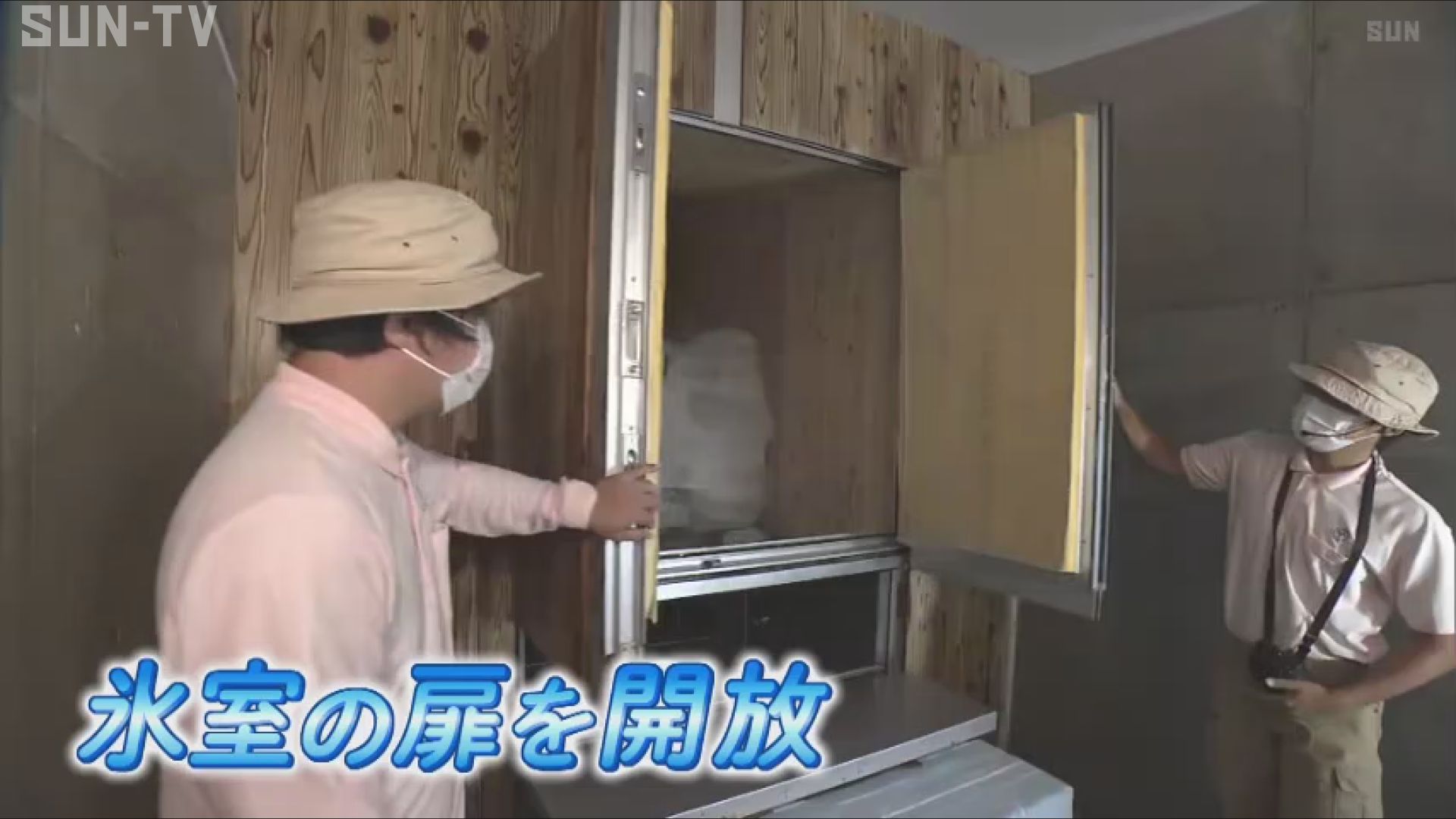 氷室では、冬の間に雨水でつくった天然の氷およそ20トンを貯蔵し、夏になると山から吹く風を氷室の中に通してさらに、「風室」と呼ばれる部屋に流し込みます。