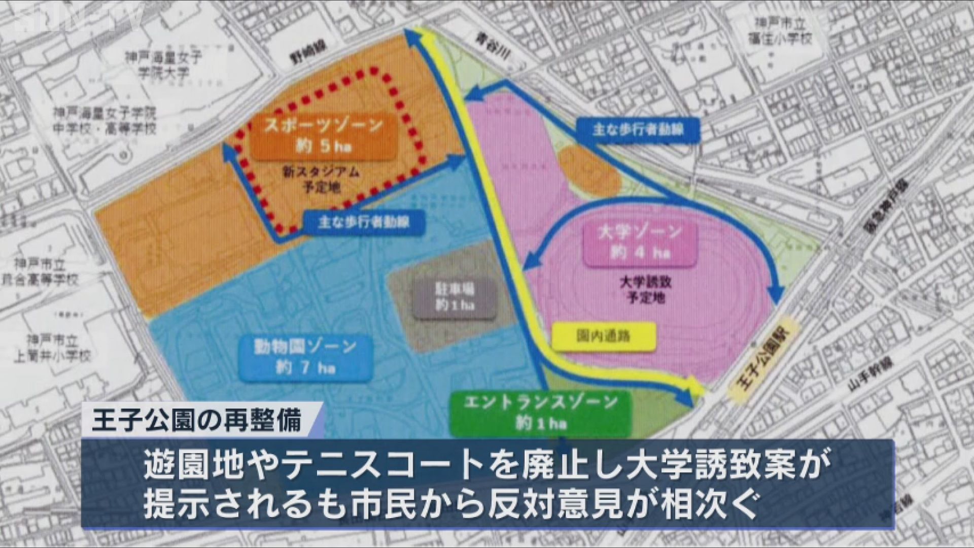 市民から反対意見が殺到した王子公園再整備案 市が意見交換会 2022.07.1422:50 地域・まち 再整備が計画されている神戸市の王子公園について、市が住民に向けた意見交換会を開きました。 意見交換会には周辺住民およそ100人が参加しました。 王子動物園などを持つ神戸市灘区の王子公園の再整備を巡っては、遊園地やテニスコートを廃止し、大学を誘致する案が提示されていましたが、市民から反対意見が相次ぎました。 14日の意見交換会で市は、廃止を撤回し、遊園地を今と同じ程度の敷地面積を残すなどの修正案について説明を行いました。 大学誘致を反対する声も多く、市は7月24日にも意見交換会を開く予定です。 #王子公園再整備案 記事のギャラリーを見る ニュース一覧へ戻る
