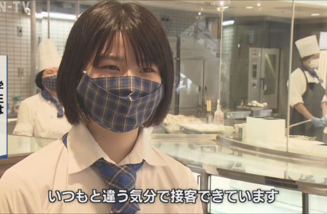 7月16日は神戸に根付いた「神戸タータン」というブランドを身にまとうことで、地域貢献することの大切さを学んでもらおうとホール業務を担当する学生が、港町・神戸の海の青色や、ポートタワーの赤色などをイメージしたチェック柄のネクタイやマスクを身に着けて接客にあたりました。