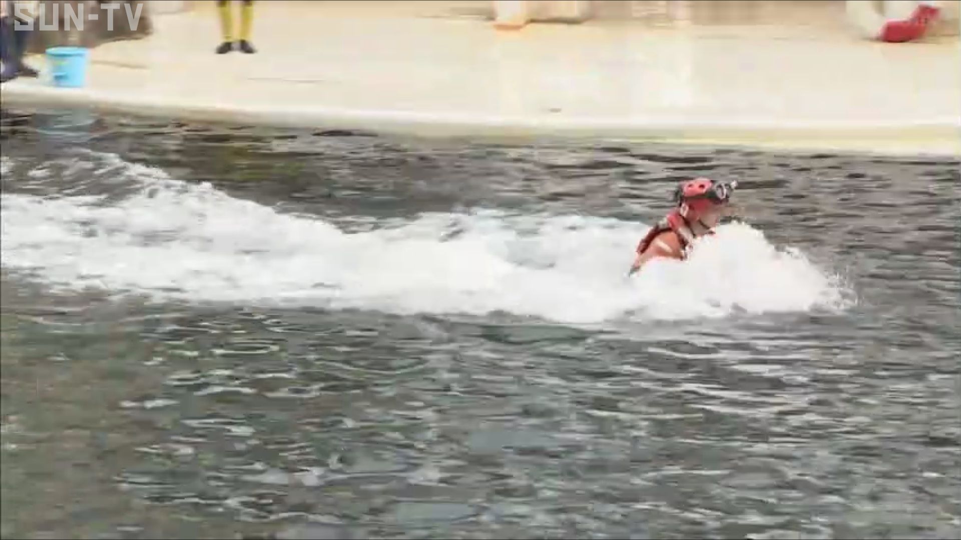 劇はセイウチと相撲を取ろうとしてプールに落ちた人を機動救難士とイルカが一緒に救助するという内容で披露されました。