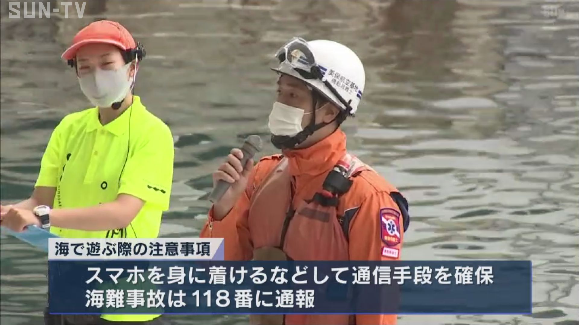 また、来園者にはスマホを身に着けるなどして通信手段を確保することの必要性や海難事故の通報は118番に掛けることなど海で遊ぶ時の注意点が伝えられました。
