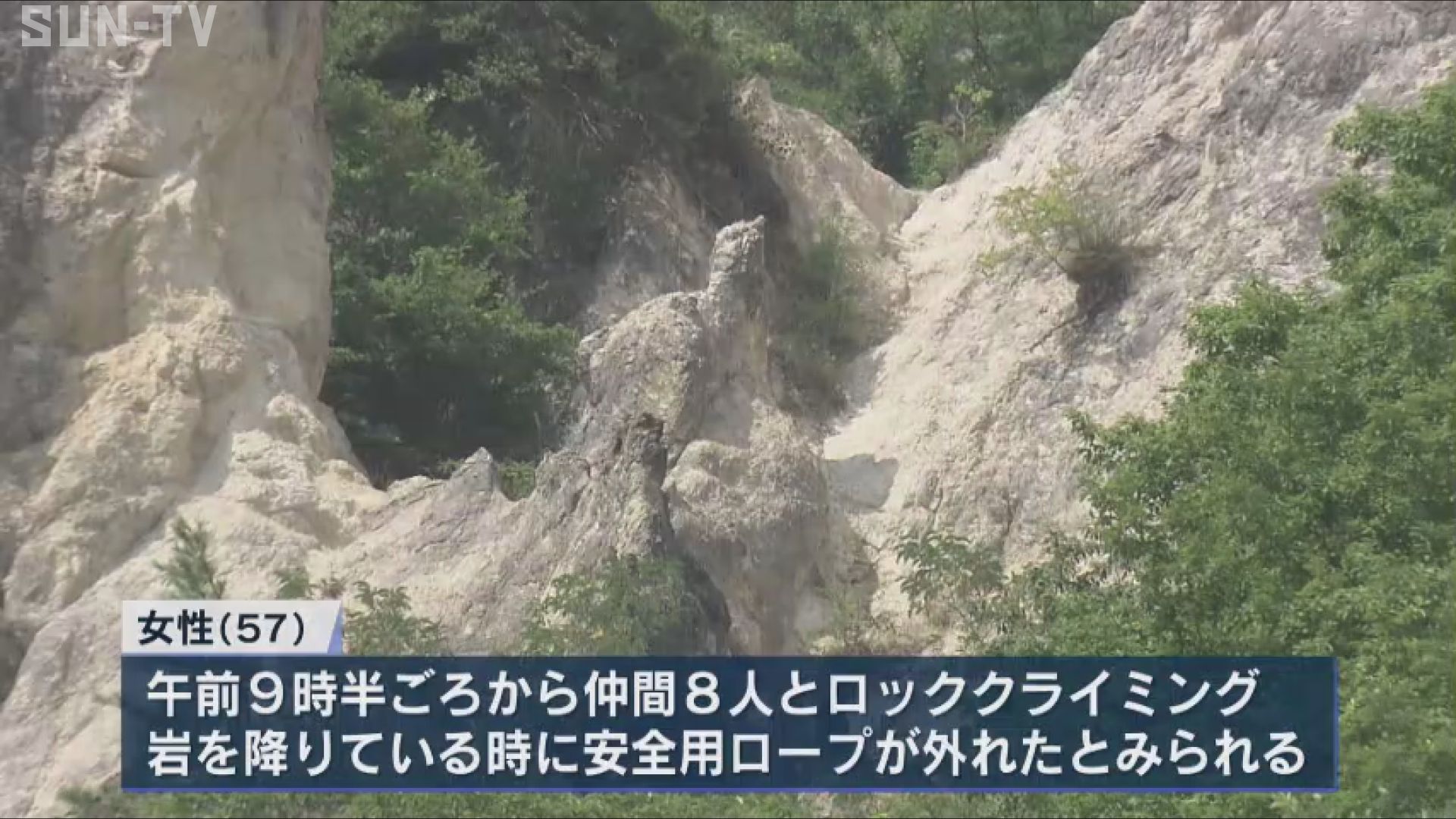 警察によりますと、女性は午前9時半ごろから、仲間8人とロッククライミングをしていましたが、岩を降りる時に身に付けていた安全用ロープが外れたということです。