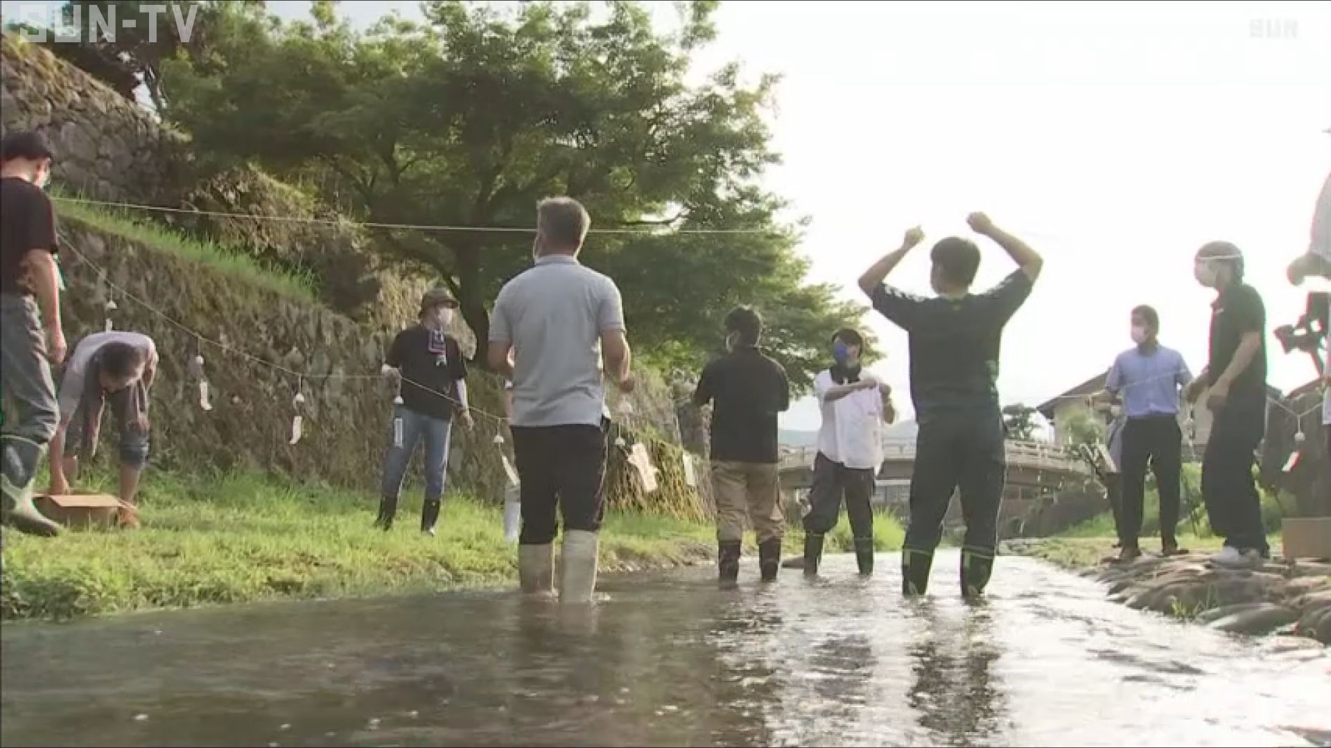 豊岡市出石町の出石城跡の近くを流れる谷山川の上にロープが張られ、さまざまなデザインが施された出石焼の風鈴およそ400個が飾られています。