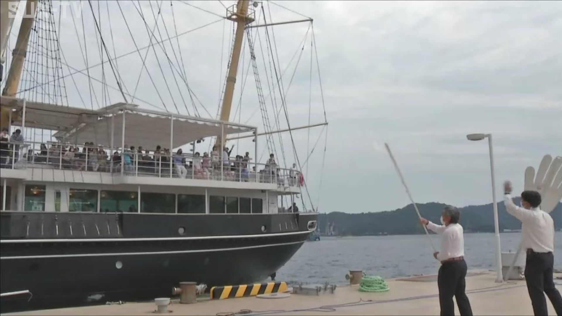 南あわじ市の福良港で「うずしおクルーズ」の船に乗り込み出発すると、桟橋から水が勢いよく打ち上げられ、船出を盛り上げます。