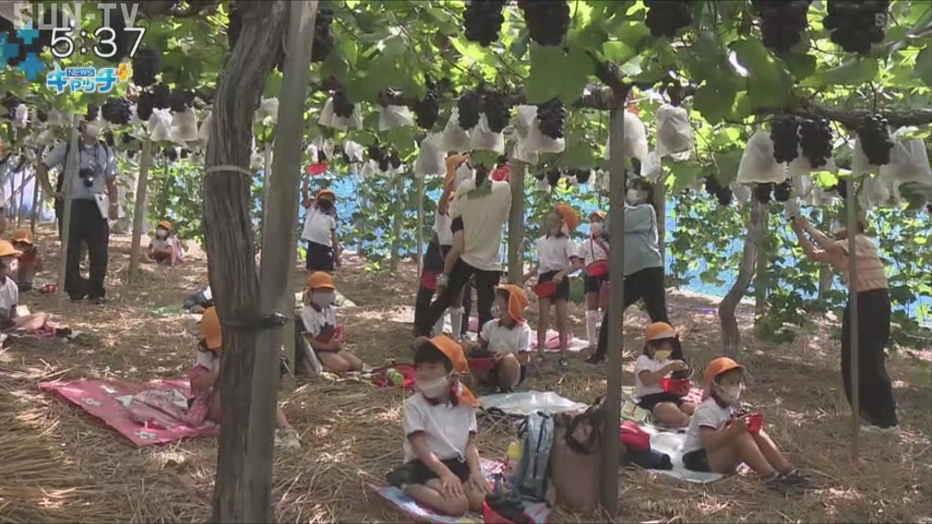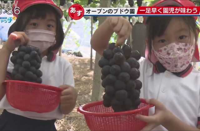神戸市西区の「岩岡観光ぶどう園」では8月13日から今シーズンのブドウ狩りが始まるのを前に、地元の認定こども園の園児たちが招待され、一足先にブドウ狩りを楽しみました。