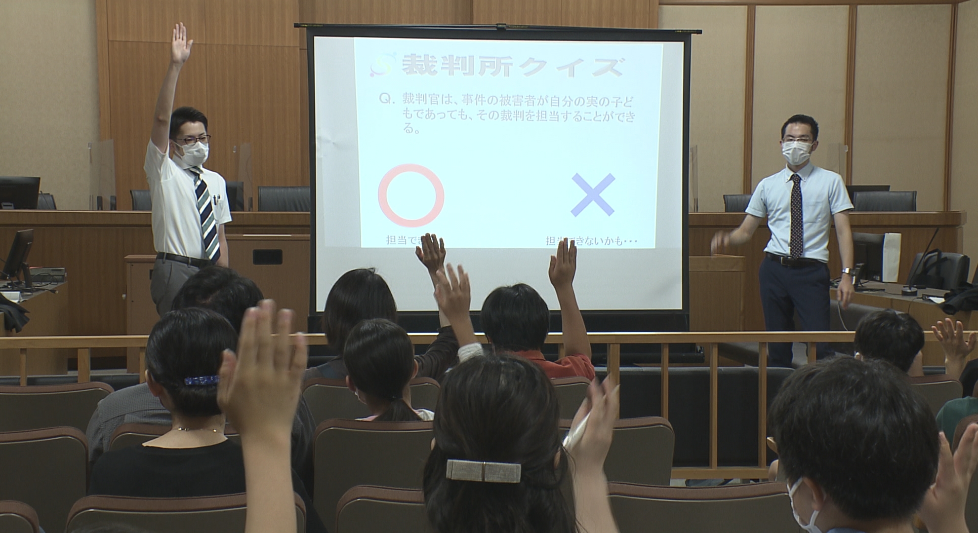 新型コロナウイルスの感染拡大の影響により対面での実施は3年ぶりで、子どもたちは実際の傍聴席に座って裁判所や法律に関するクイズに挑戦しました。