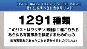 厚労省が把握したのは、2021年2月28日までの3カ月間の有害事象報告についてです。安全性に関しては新しい懸念はないとする一方で、日本国外で1223人の接種後の死亡報告。特に注視すべき項目として心臓や脳などのさまざまな臓器、神経など、1291種類のワクチン接種後に起こりうる有害事象のリストが記されていました。このリストはワクチン接種後に起こりうるあらゆる有害事象を検証するためのもので、有害事象があったことを報告するものではありません。