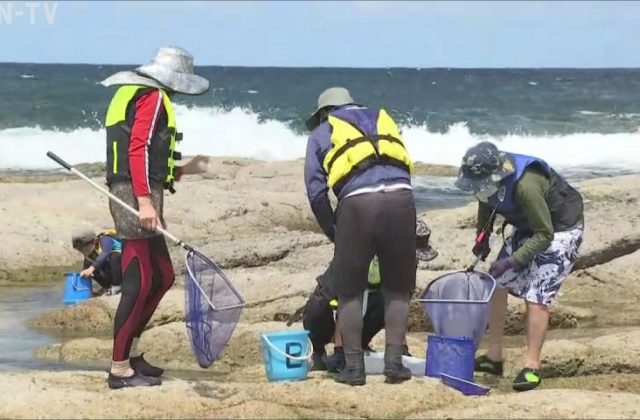 参加者たちは網やバケツを持って生き物を捕まえたり海藻を観察するなどして磯の生態系を学んでいました。