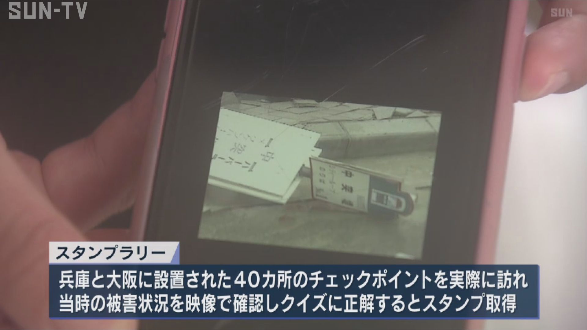 スタンプラリーは専用アプリ「furari(ふらり)]を使用。兵庫と大阪に設置された40か所のチェックポイントを実際に訪れ、それぞれの場所で当時の被害状況を映像で確認し、クイズに正解するとスタンプを取得できます。
