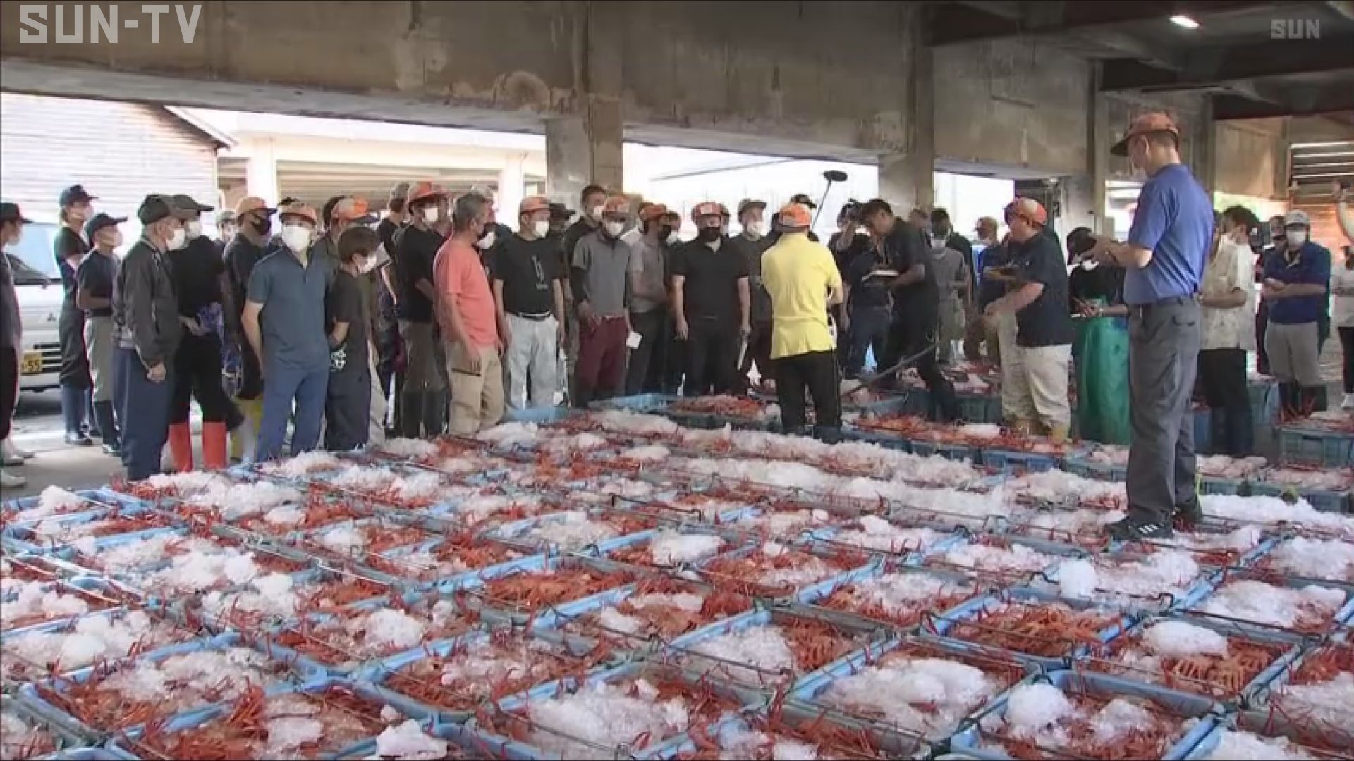日本海の秋の味覚・ベニズワイガニの初競りが5日朝、兵庫県香美町の香住漁港で行われました。