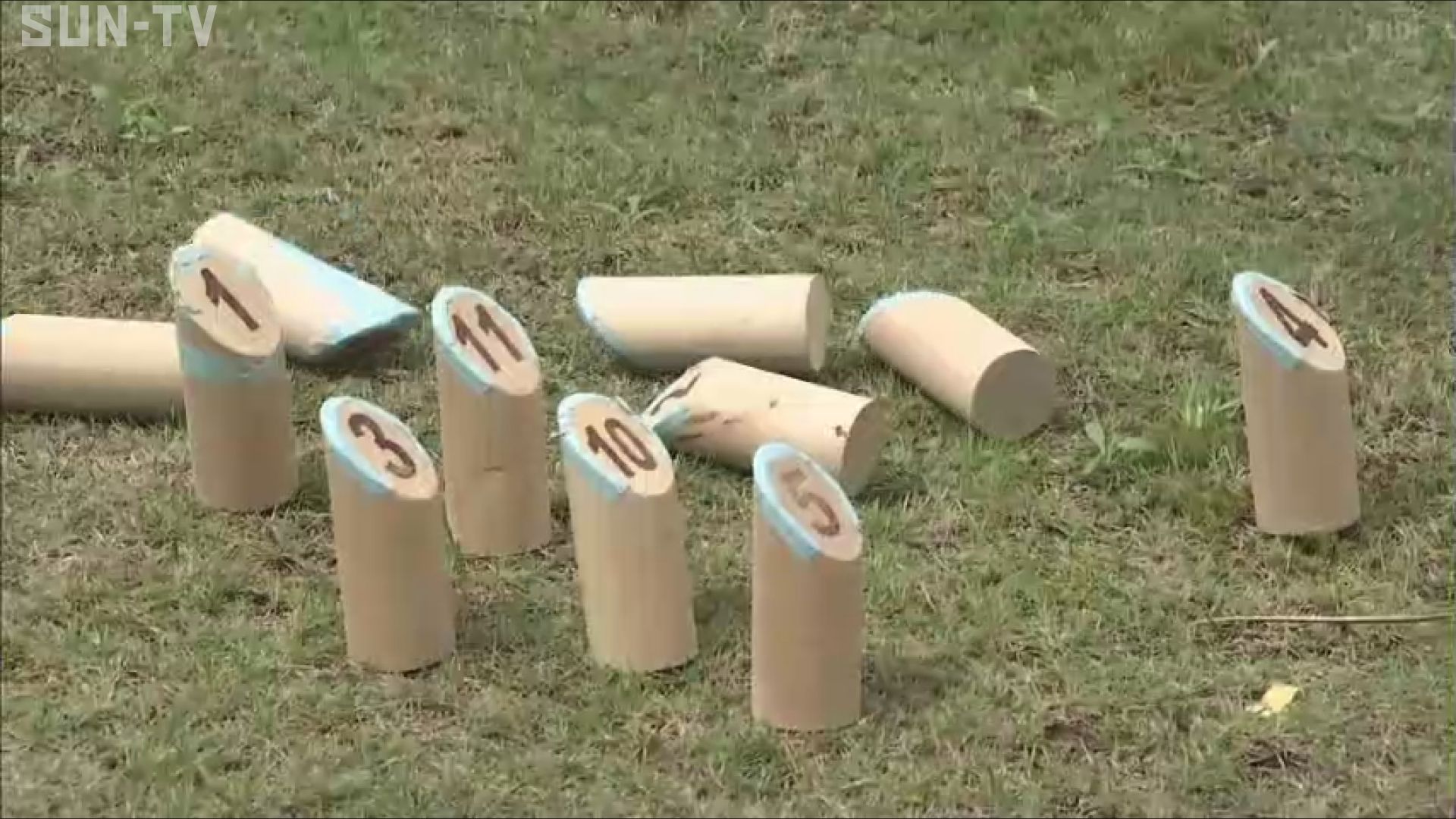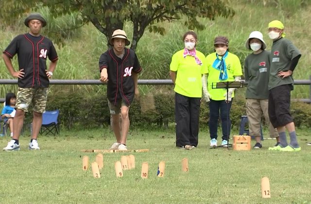 9月11日はモルック大会が開かれ、参加者たちはピンに向かって木の棒を投げて心地よい汗を流していました。