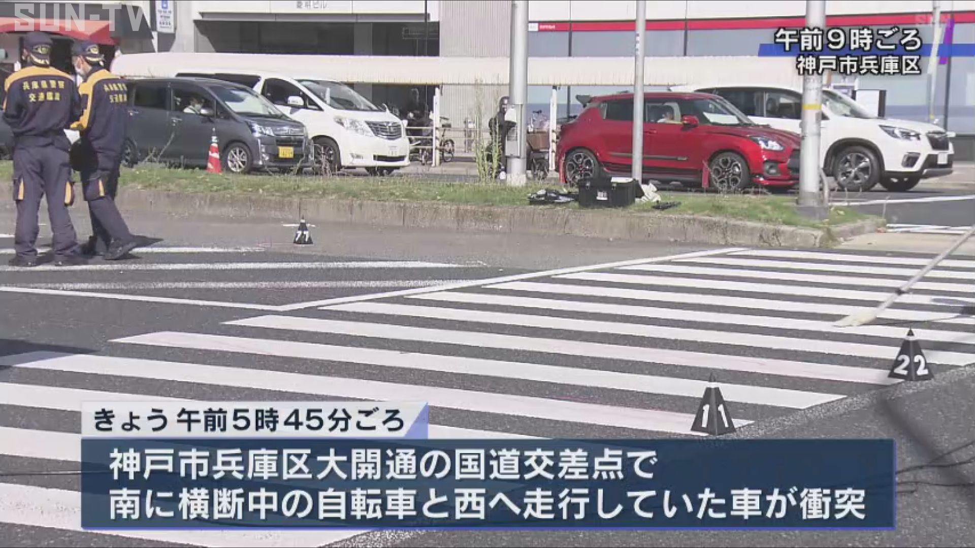 13日午前5時45分ごろ、神戸市兵庫区大開通の国道交差点で、南に向かって渡っていた自転車と西へ走行していた車がぶつかりました。 自転車に乗っていたのは、40代の男性で、男性は、頭を強く打つなどし病院に運ばれましたが、意識不明の重体です。