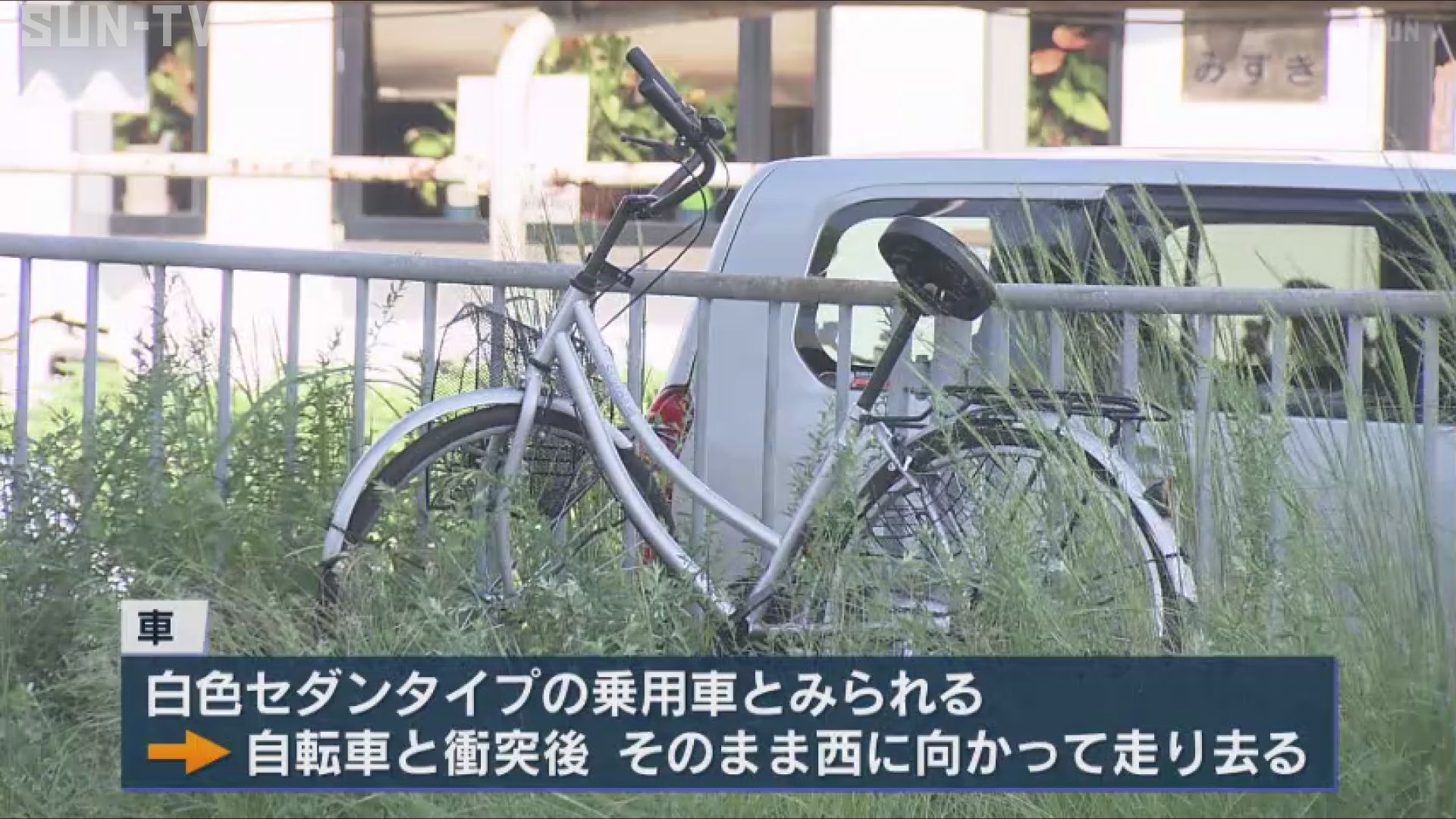 警察によりますと、車は白色で、セダンタイプの乗用車とみられていて、自転車と衝突した後、そのまま西に向かって走り去ったということです。 警察が、ひき逃げ事件として逃げた車の行方を追っています。