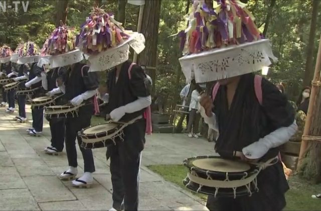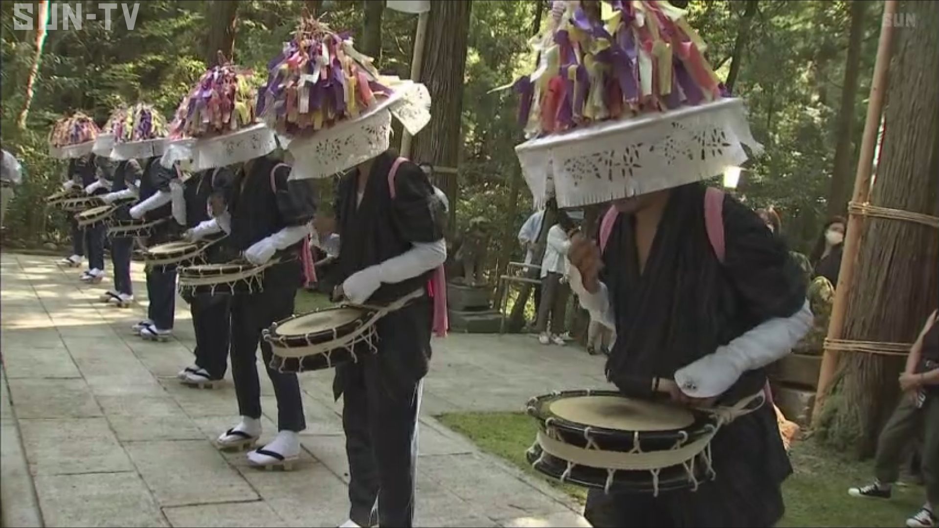 15日はまず、久谷八幡神社で、14歳から53歳までの踊り手8人が、縞絣の単衣姿に一文字笠をかぶり、腰につけた平太鼓を叩きながら、「ザンザカザットウ」の掛け声とともに踊りを奉納。 その穏やかな動きは、但馬の中で最も古い形が伝えられているということです。