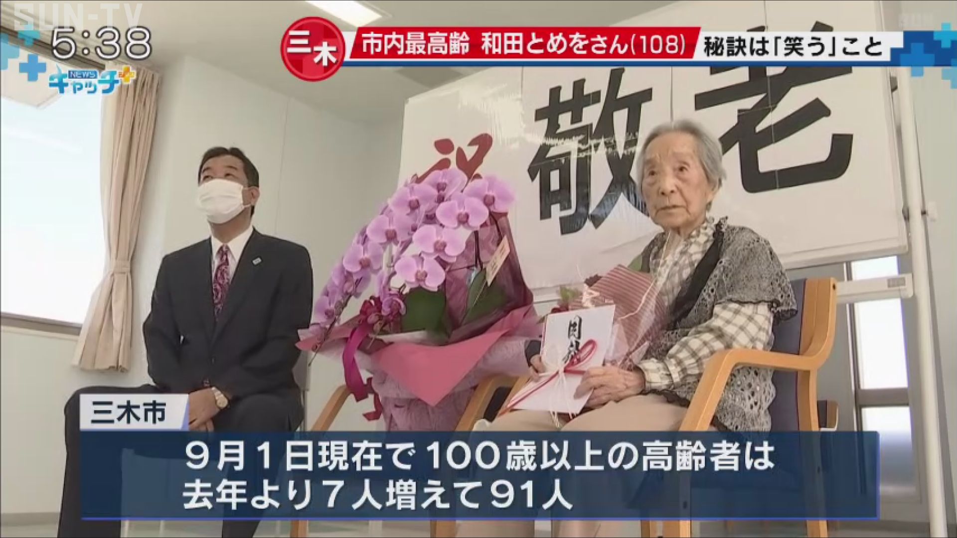 三木市では、9月1日現在で100歳以上の高齢者は、去年より7人増えて91人だということです。