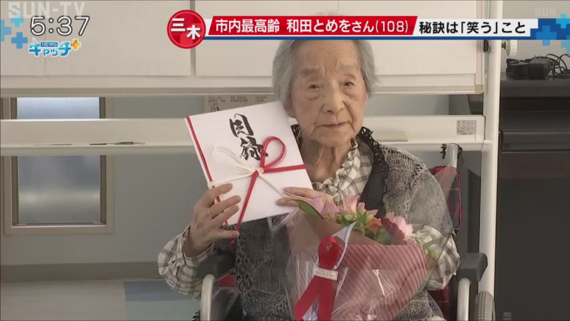 三木市内最高齢で仲田市長の訪問を受けたのは、特別養護老人ホームに入居する108歳の和田とめをさんです。