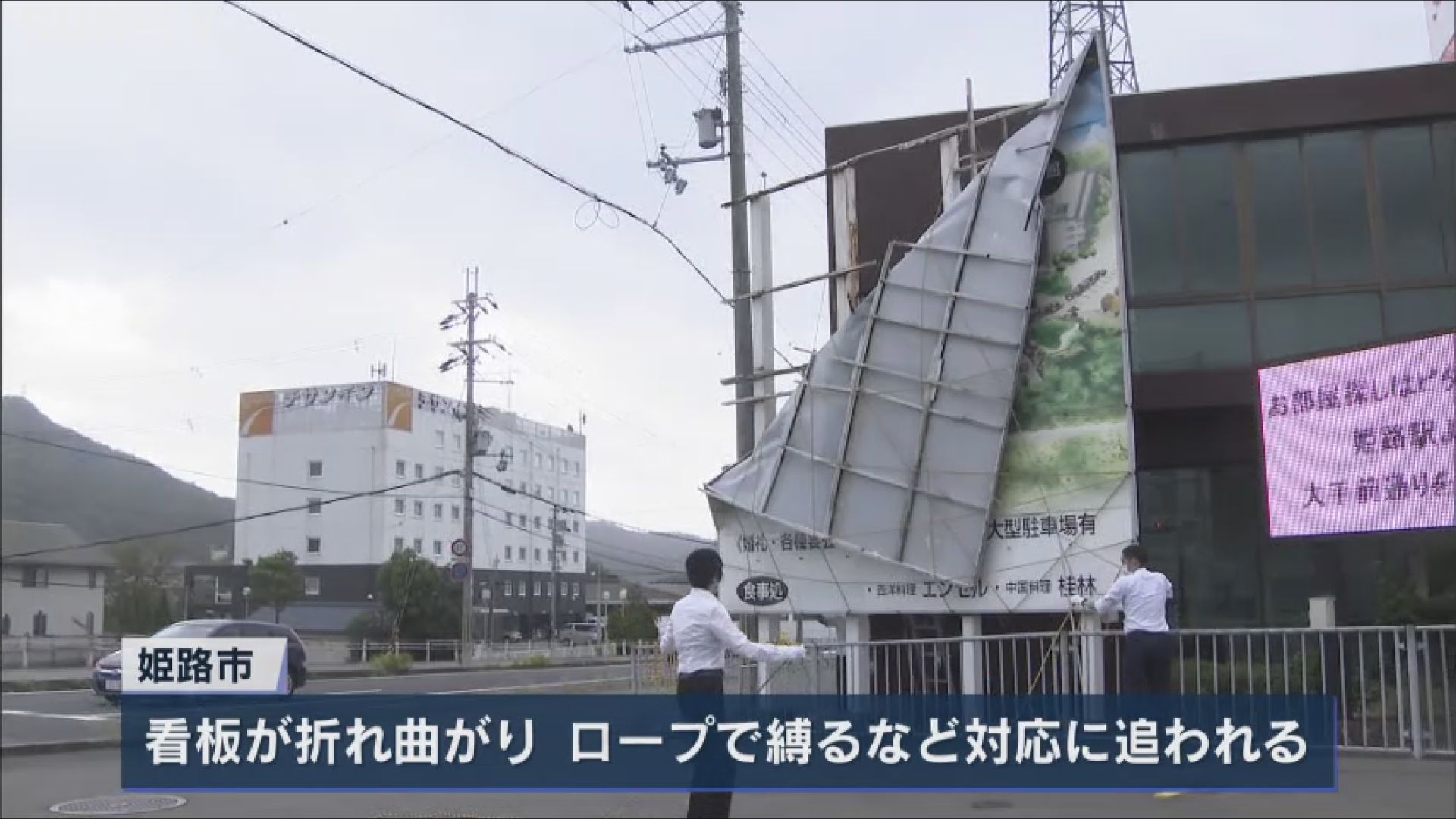 暴風域に入った姫路市では、看板が折れ曲がり、ロープで縛るなど対応に追われていました。