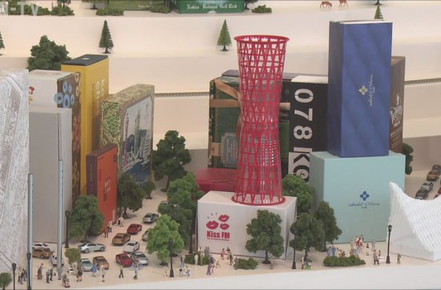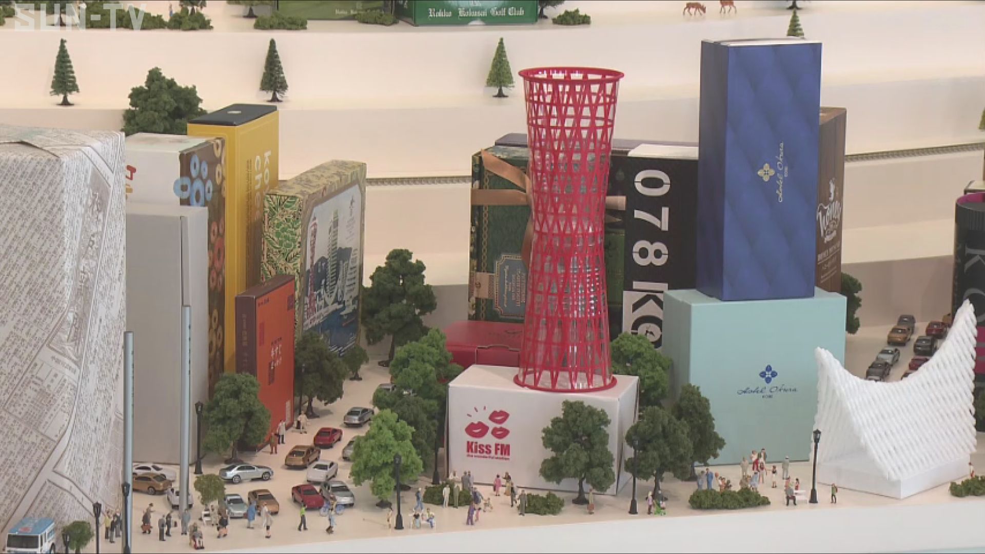 神戸の町並みを、お菓子の空き箱や紙袋で表現した巨大ジオラマ。 神戸空港の屋上展望デッキに30日オープンしたのは、ミニチュア写真家・田中達也さんの常設ミュージアムです。