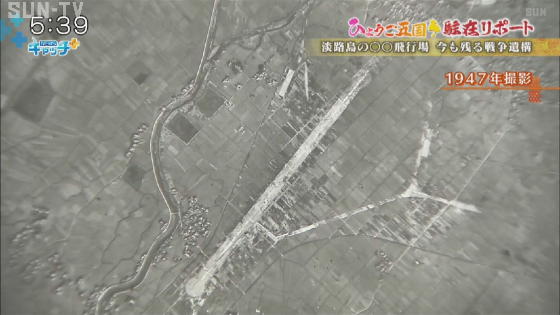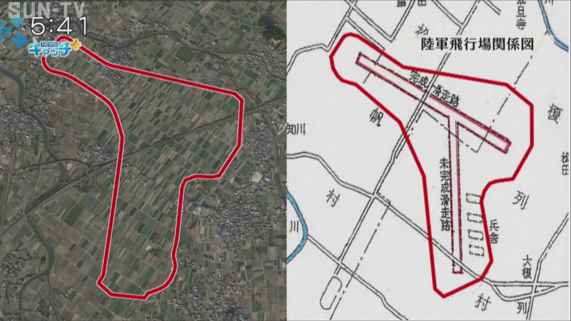 これは終戦後に撮影された航空写真です。ここにははっきりと滑走路が写っています。そして、飛行場があった辺りは今も飛行場の名残をとどめています。