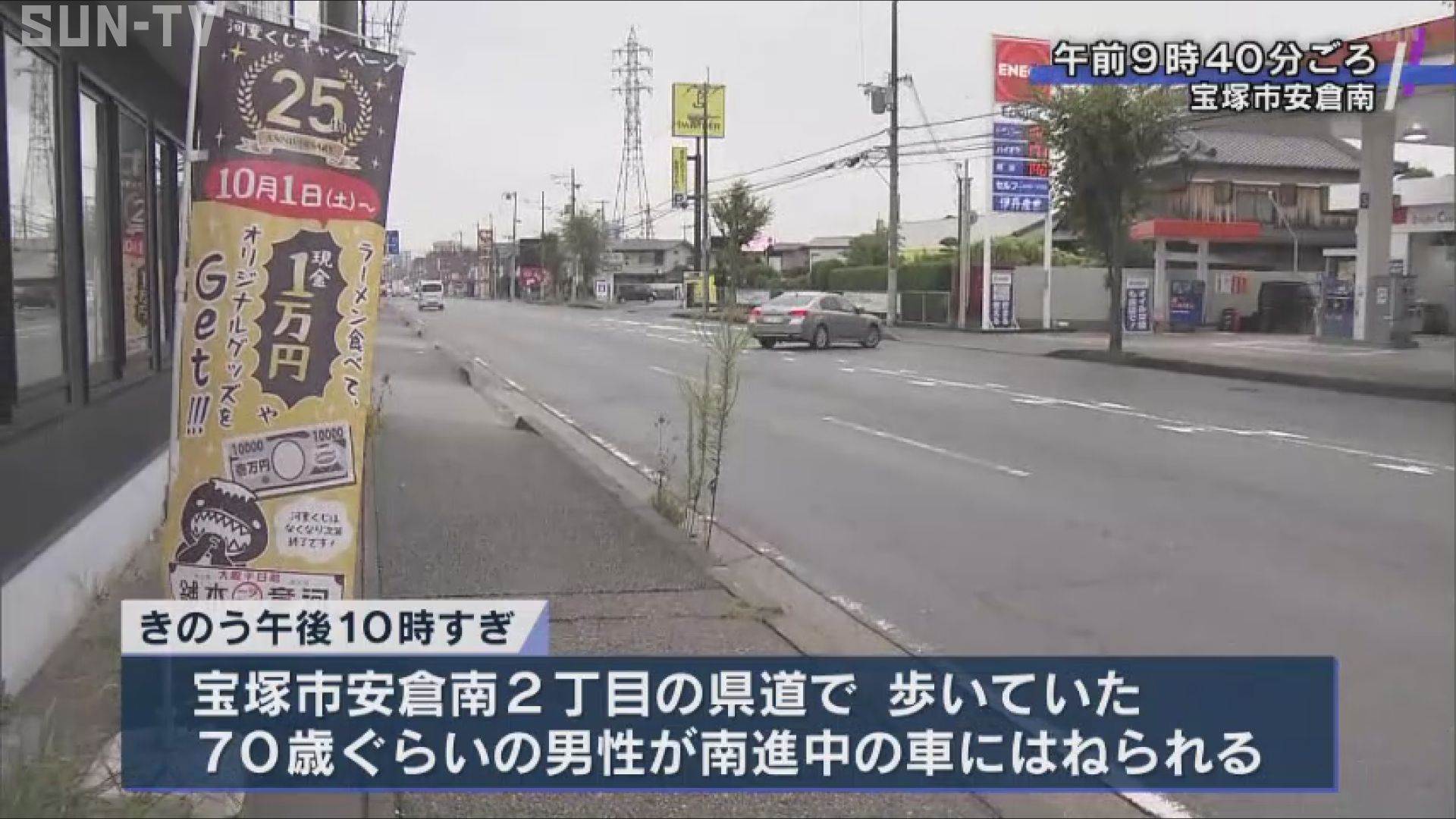 16日午後10時すぎ、宝塚市安倉南2丁目の県道で、歩いていた70歳ぐらいの男性が南に向かって走っていた車にはねられました。