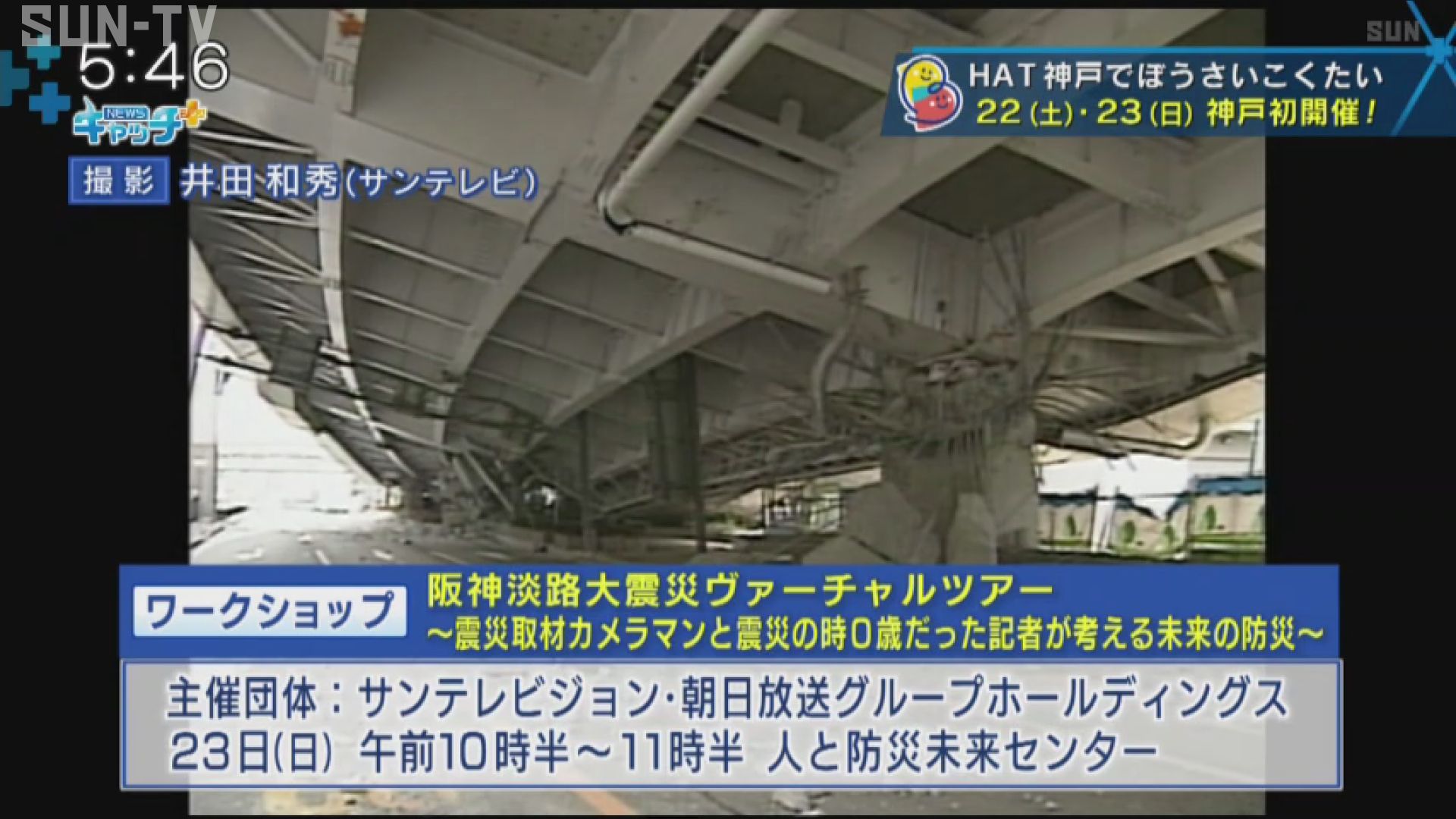 サンテレビも朝日放送グループと共同でワークショップを開催。27年前の阪神淡路大震災で神戸の被災地を撮影したサンテレビの井田和秀(当時)カメラマンと、朝日放送テレビのカメラマンや震災当時0歳だった記者がアーカイブ映像と現在のまちの姿を比較しながら未来の防災について語り合います。