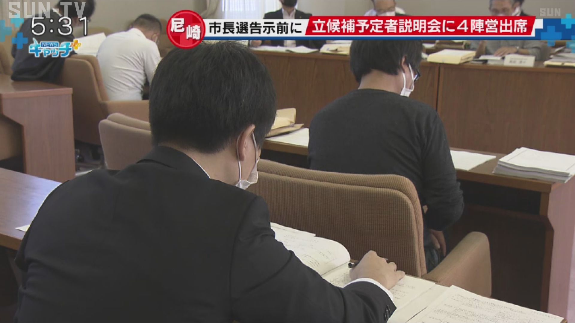 任期満了に伴う尼崎市長選が来月13日に告示されるのを前に、立候補予定者に対する説明会が19日に開かれ、4つの陣営が出席しました。