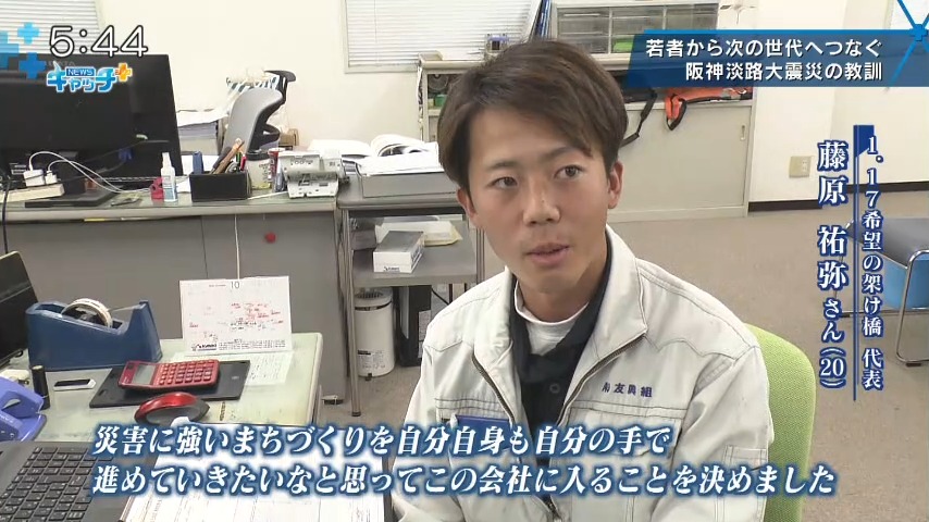 藤原祐弥さん、20歳。神戸市須磨区の建設会社で働きながら「1.17希望の架け橋」の代表として活動しています。