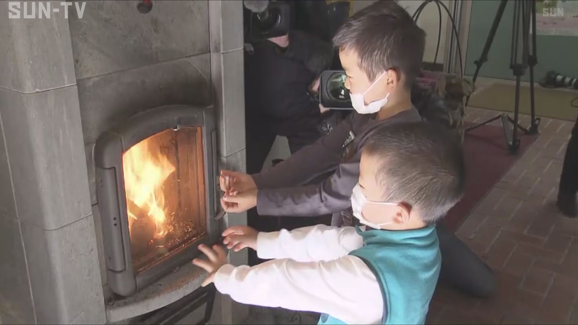 開始からおよそ10分で火おこしに成功。その後、自分たちの手で火を玄関ホールにあるストーブに移しました。