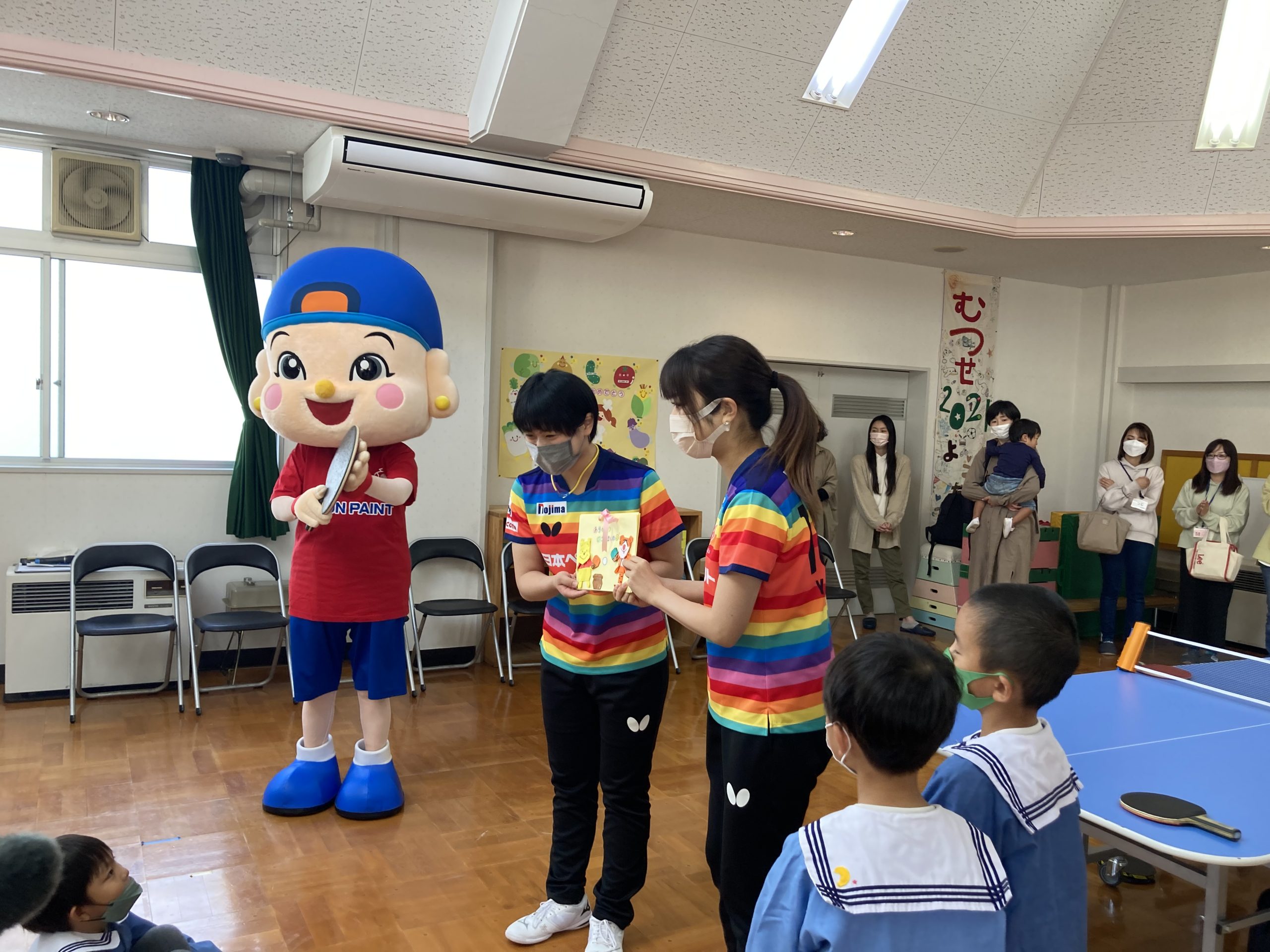 この取り組みは、日本ペイントグループが長年取り組んでいる社会貢献活動のひとつで、これまでも全国の保育園や小学校・支援学校・高齢者施設等に卓球台を寄贈してきたものです。今回の寄贈は、グループ会社である日本ペイントマリン株式会社(本社:大阪市北区)を通じて行われ、卓球台の贈呈式には日本ペイントマレッツの面田采巳(おもだ ことみ)選手、打浪優アンバサダーのほか、チームマスコットのマレットちゃんも参加しました。
