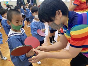 こども卓球台寄贈式のあとには、六瀬幼稚園の園児を対象にした卓球教室も開かれ、園児一人ひとりに面田選手がついて寄り添いながらボールの打ち方を教えていました。