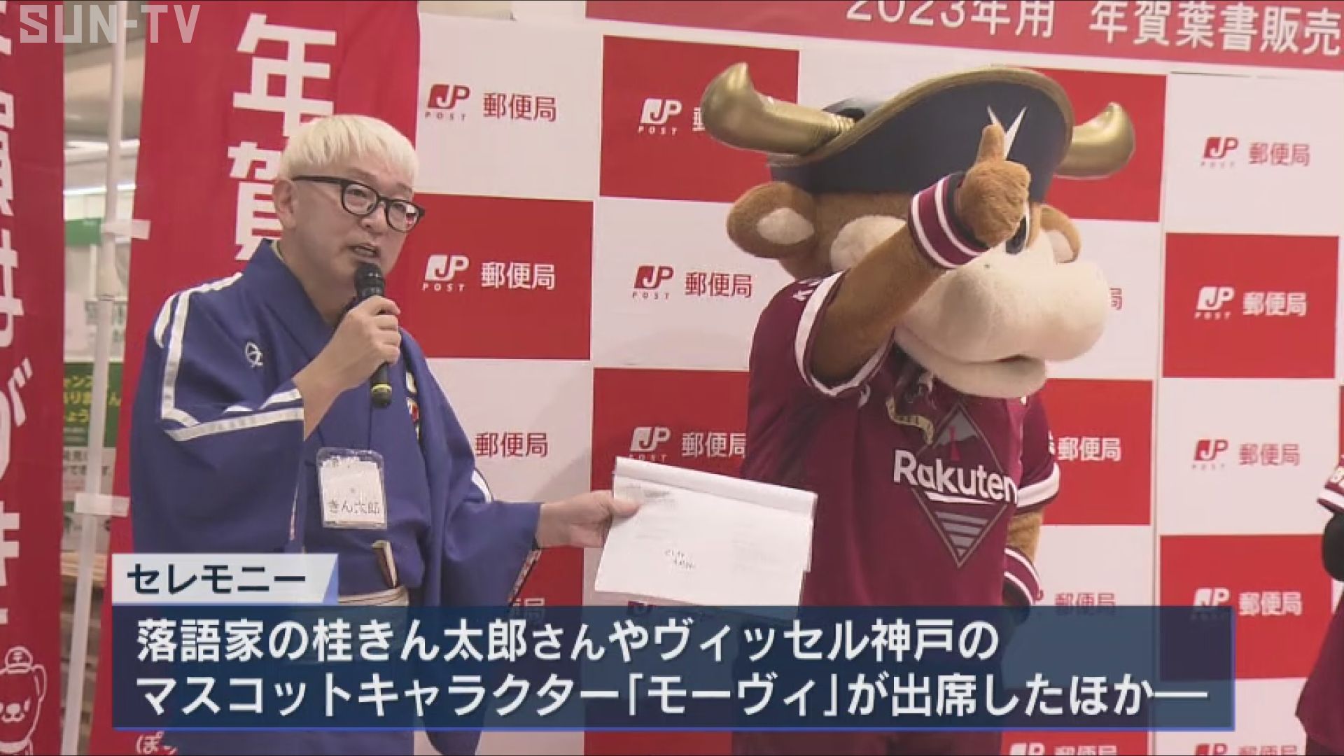 神戸中央郵便局で3年ぶりに開かれたセレモニーには、落語家の桂きん太郎さんや、ヴィッセル神戸のマスコットキャラクター・モーヴィが出席したほか、地元の幼稚園児たちが元気いっぱいのダンスを披露し、年賀はがきの販売を祝いました。