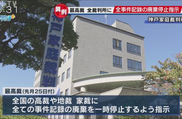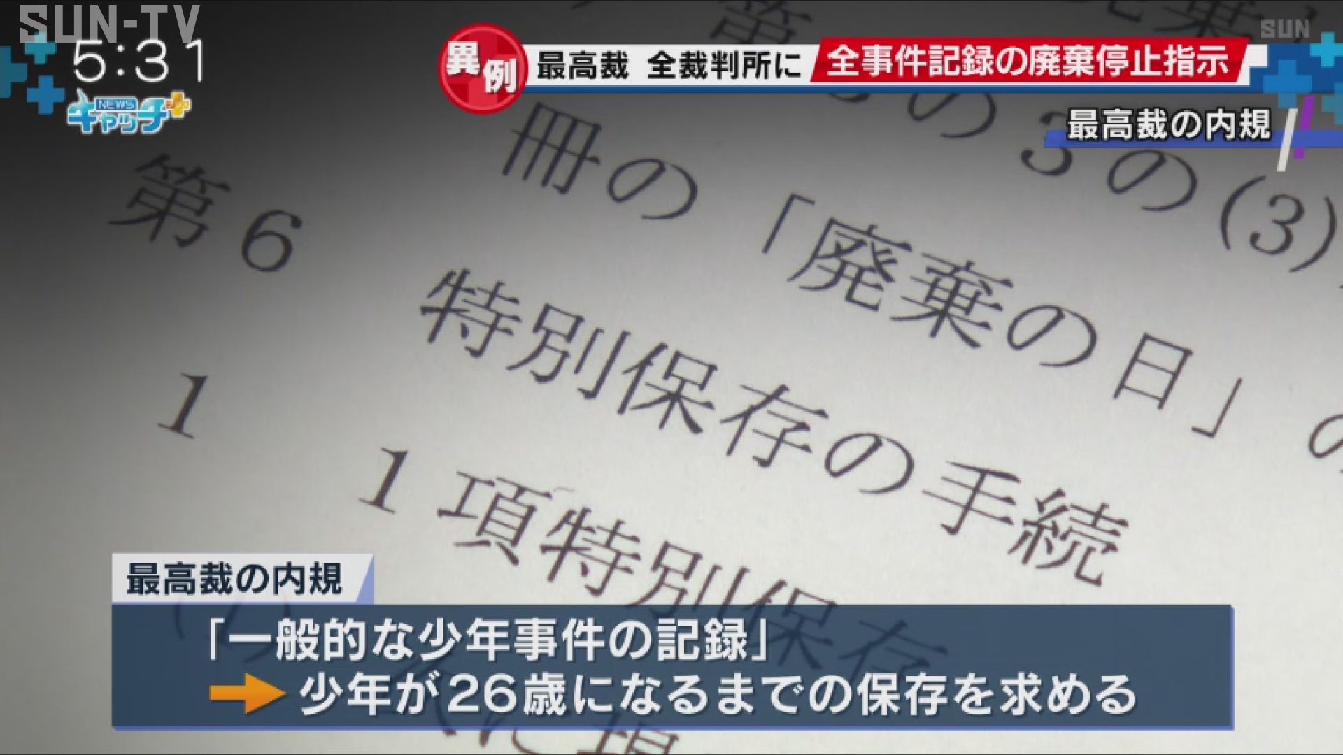 しかし、小学生2人が殺害された1997年の神戸連続児童殺傷事件など重大少年事件の記録が廃棄されていたことが相次いでわかり、最高裁は10月25日付けで全国の高裁や地裁、家裁に対し、すべての事件記録の廃棄を一時停止するよう指示を出しました。