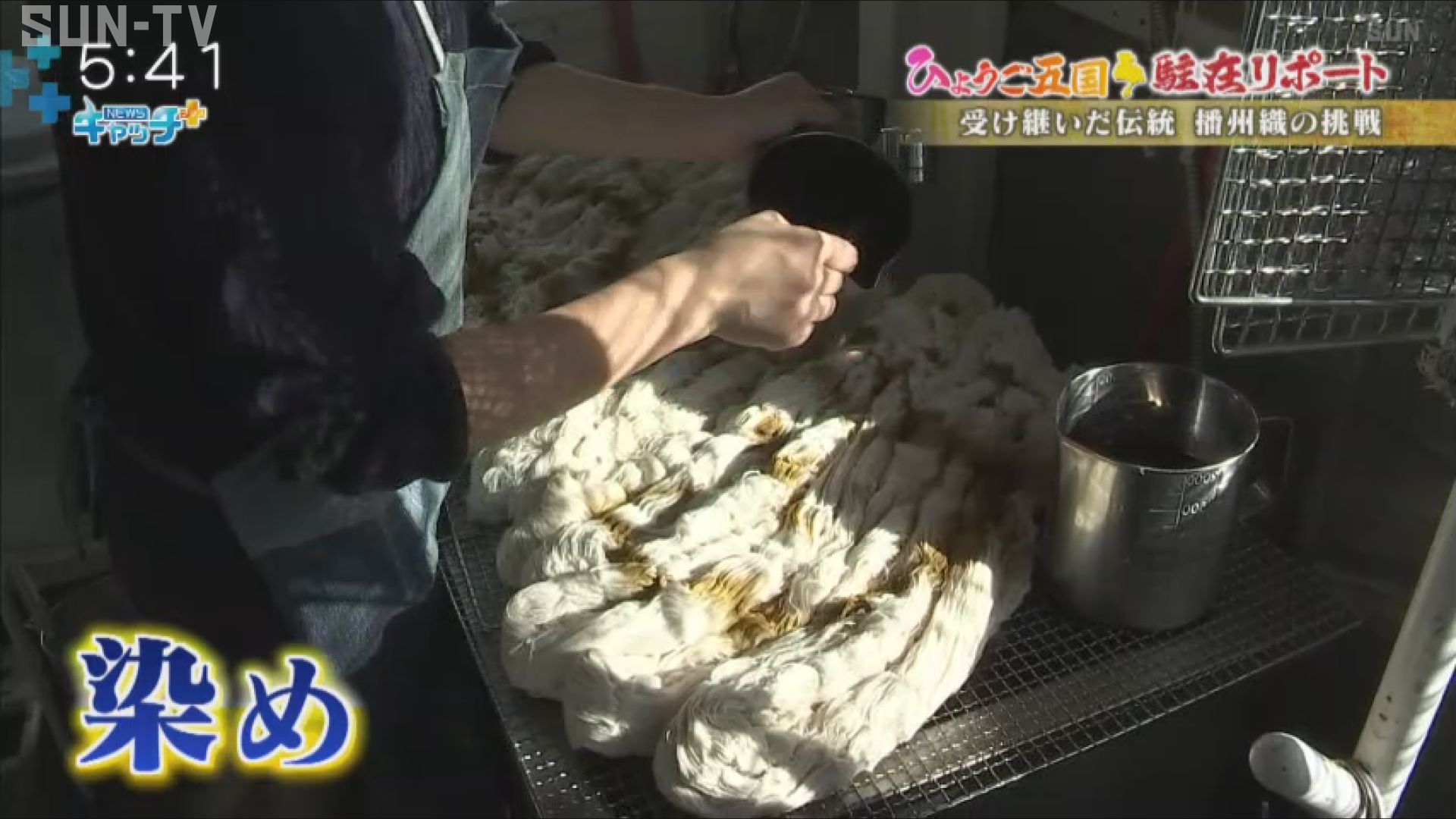 彼女もやってますけど、『かせ』という糸の束を『むら染め』している。」