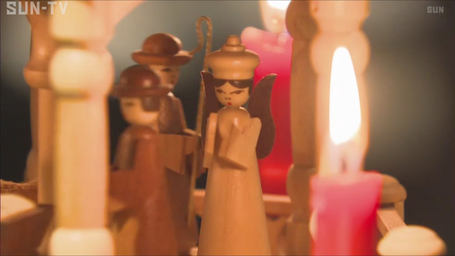 キャンドルに火をともすと気流で上の羽根が回転し、人形台も一緒に動きます。