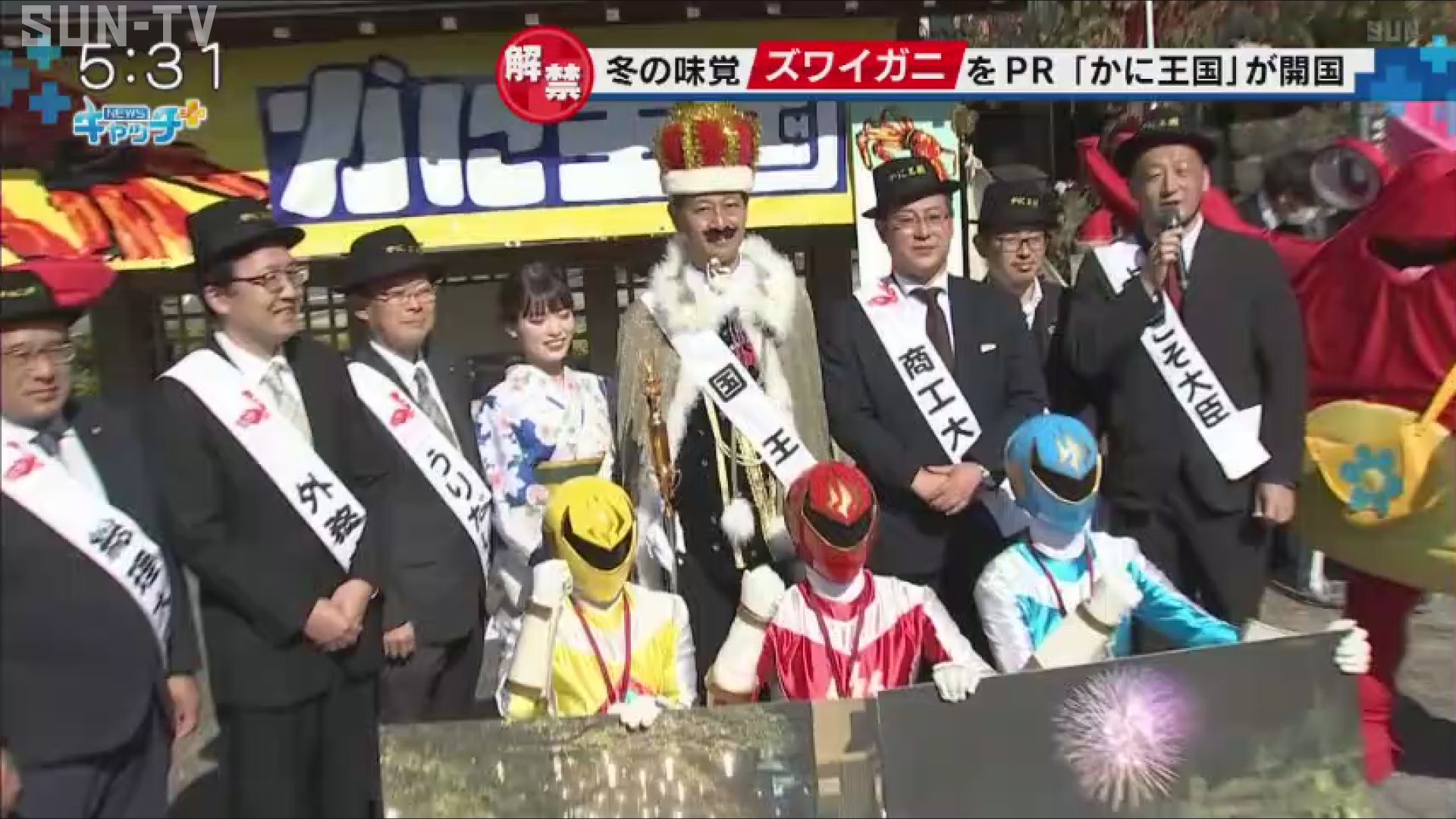 続いて、「かに王国」の国王を務める城崎温泉観光協会会長が開国を宣言し、城崎のご当地ヒーロー・オンセンジャーを親善大使に任命しました。