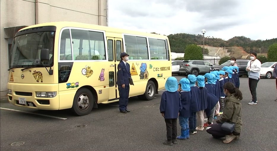 この訓練は園児が送迎バスに取り残された場合に周囲に助けを求める方法を知ってもらおうと美方警察署が実施したもので、新温泉町の認定こども園に通う園児16人が参加しました。