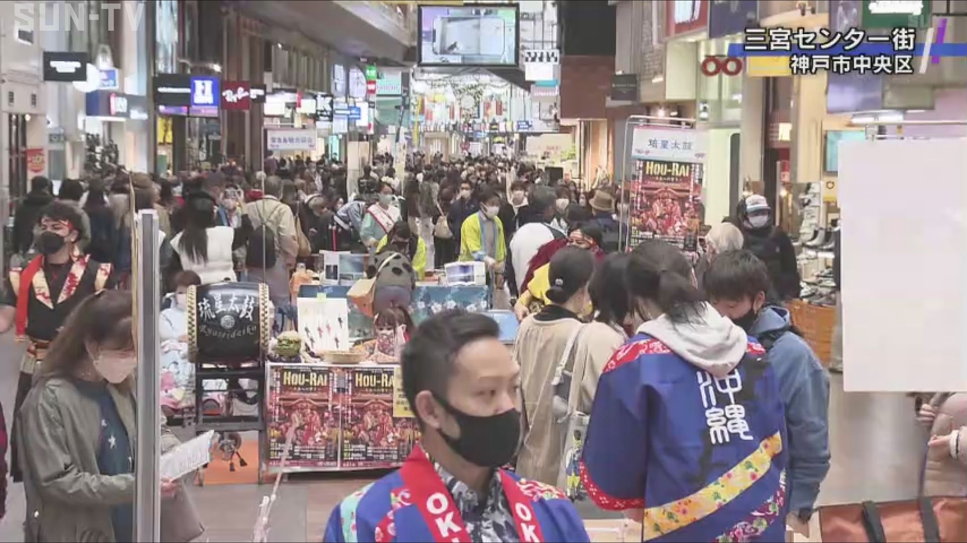 会場となった三宮センター街では、神戸と沖縄を結ぶ航空会社などが観光情報を発信し、物産品の販売や郷土料理の提供なども行われました。