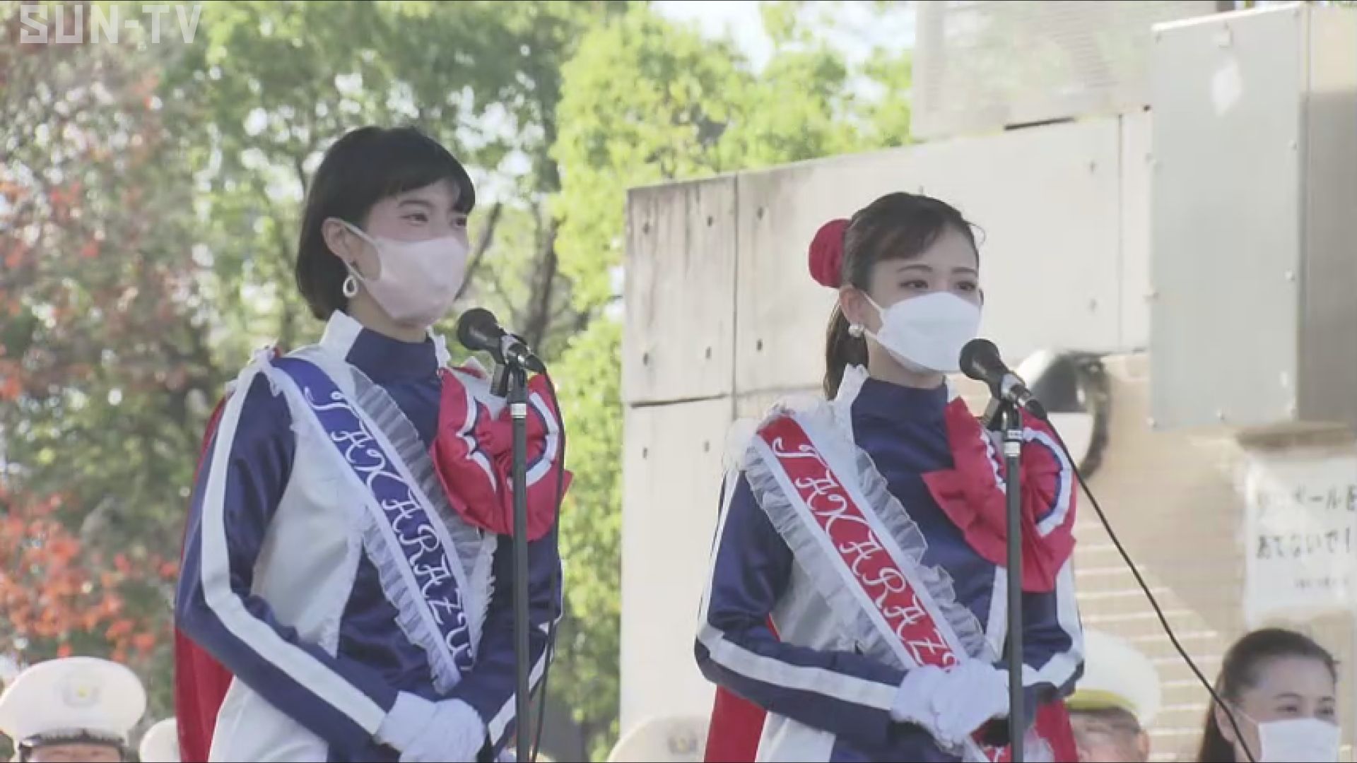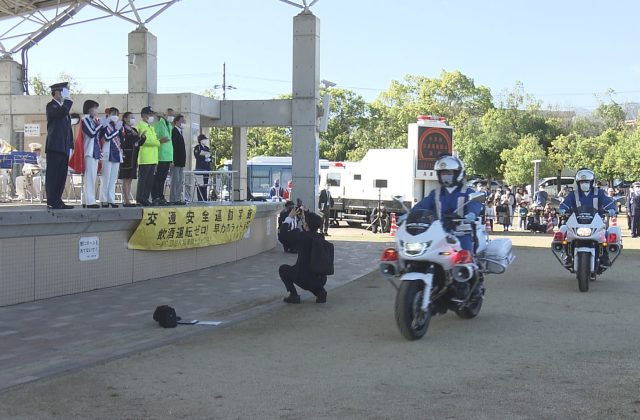 出発式では、宝塚観光大使のリボンの騎士「サファイア」を務める2人が交通安全宣言を行い、歩行者の安全を確保することや日没に合わせて早めにライトを点灯するよう呼び掛けました。