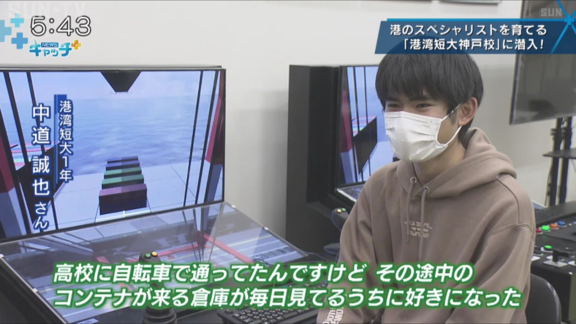 真剣に画面を見つめ、ハンドルを操縦する生徒がいます。愛知県出身で港湾技術科の中道誠也さんです。ガントリークレーンのシミュレーターでコンテナを積み込む練習をしています。