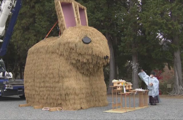 来年の干支「卯(うさぎ)」にちなんで、稲穂で作ったジャンボなウサギの飾りが登場しました。