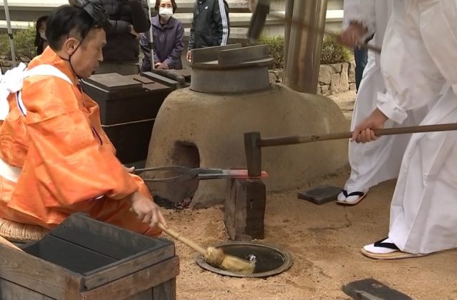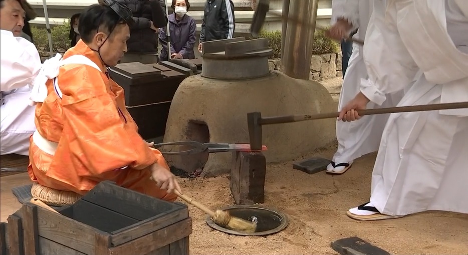 登録後初めての開催となったまつりでは、神事のあと、金物神社境内にある古式鍛錬場で、古式装束をまとった工匠が風を送る機械・鞴で火を起こして伝統的な技術で鋼を鍛錬する「火入式」が執り行われました。