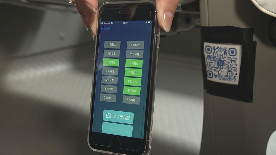 ひとつ目は園児らが車内に残っていないかを確認する際に、座席の下に付けられたQRコードを読み取ります。全ての席のコードを読み取らなければ完了の報告ができないようになっていて、確認を終えると職員室にメールが届き、バスに乗っている職員と職員室側が二重にチェックできる仕組みです。